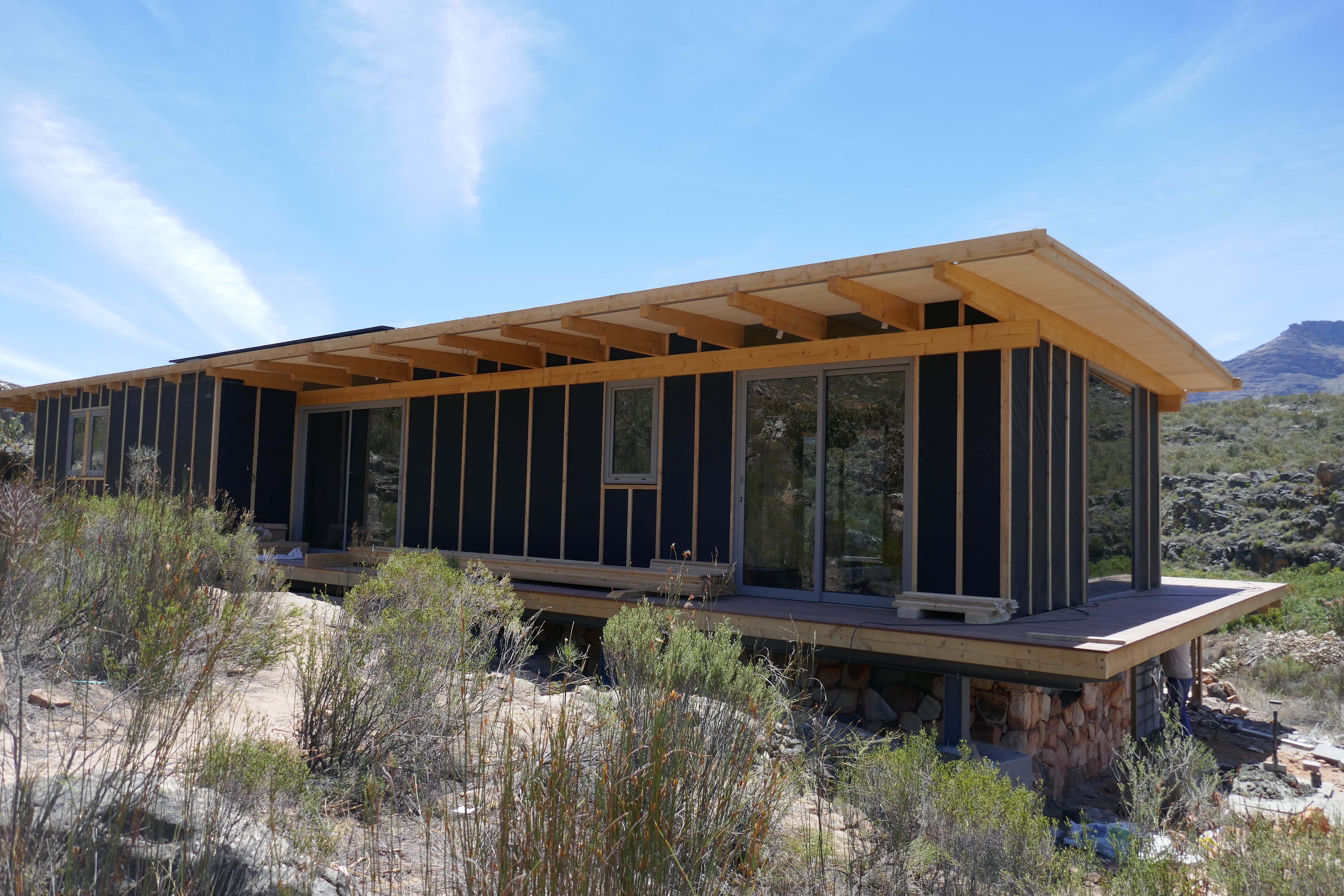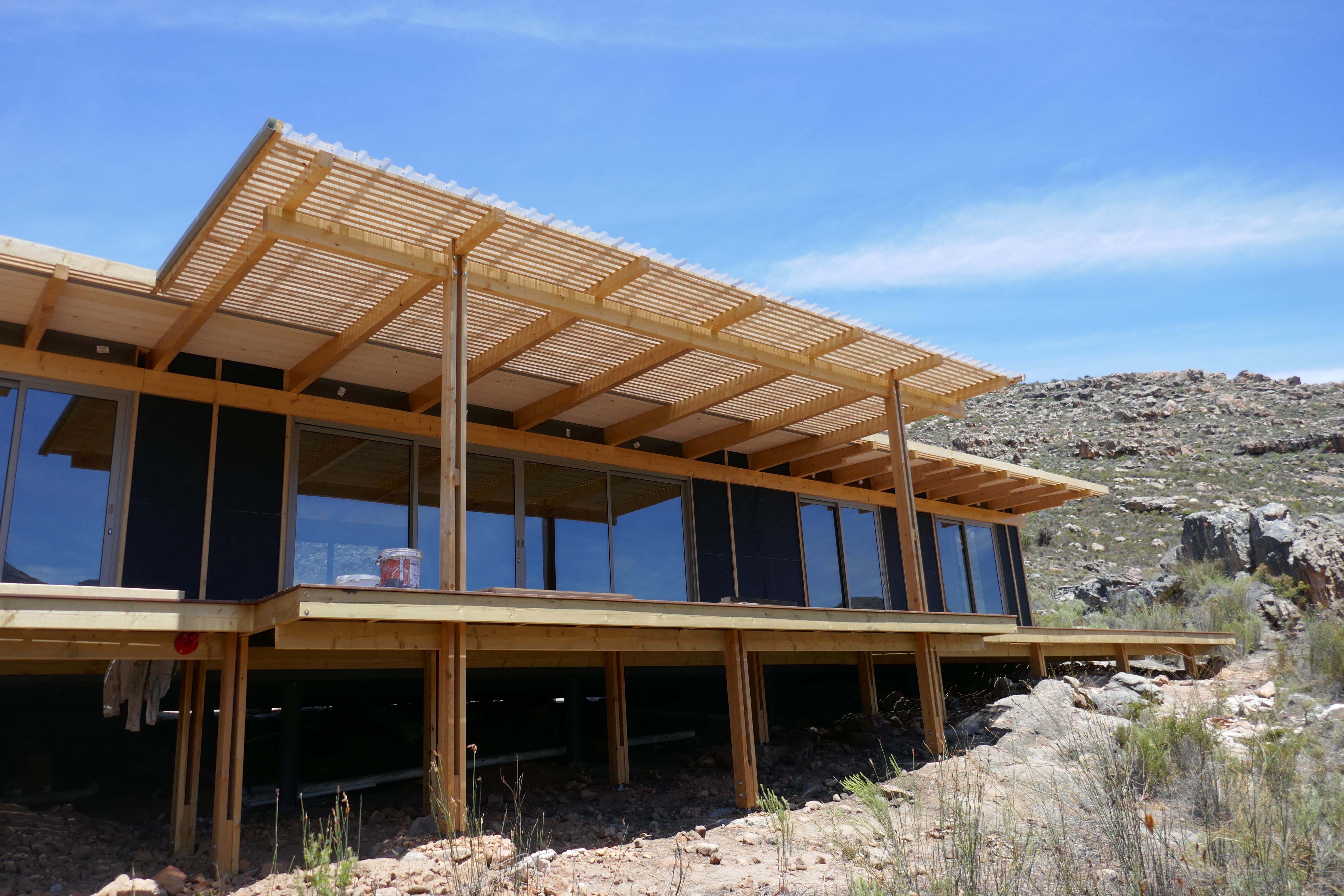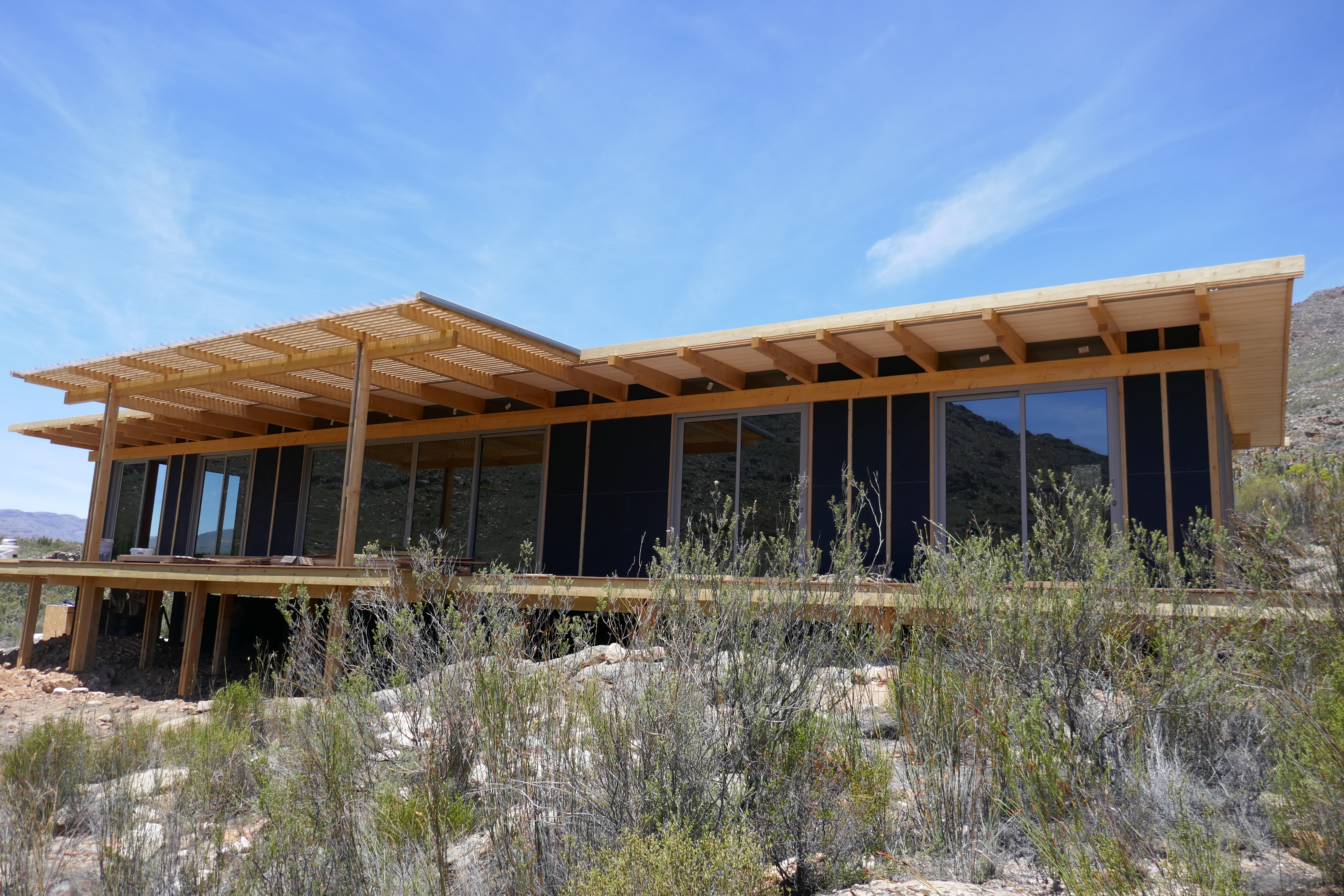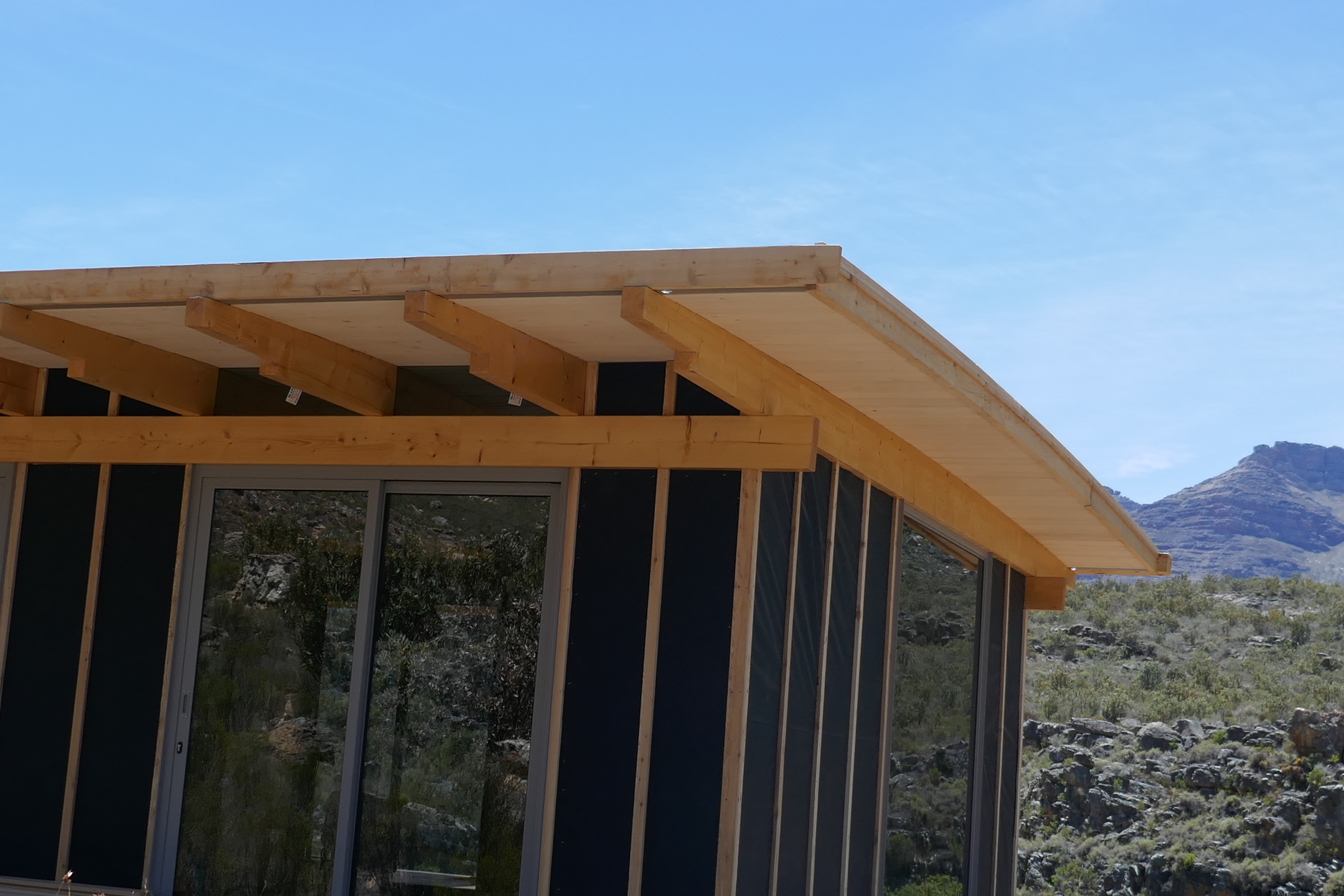 Mountain House Design OverviewSpecification Brochure Galleries Bedrooms : 3 Bathrooms : 2 + Guest WC Living Space : 140sqm foot print (21.6m long) Extras : 104 sqm solid wood decking in front on substructure (optional) Penthouse Apartments Cradle of Humankind